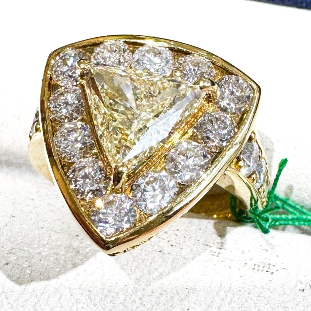 トリリアントダイヤモンドリング 2025年1月12日 by ijima 1.508ct VLY VS2 中石は、トリリアントカット(△)のダイヤモンド 1.508ct ベリーライトイエロー VS2 通常の1.5ctサイズより場面が大きく見えます。 センターのイエローダイヤモンドを引き立たせるために廻りを取り巻くダイヤモンドメレは大粒の美しいラージメレ。 取り巻きのダイヤモンドは合計2.43ct(1粒あたり0.20ct) レールの中に埋め込み引っ掛かりが無いようにしています。 迫力満点のダイヤモンドジュエリーです。 今回の特別価格で 130万円税込で販売致します。