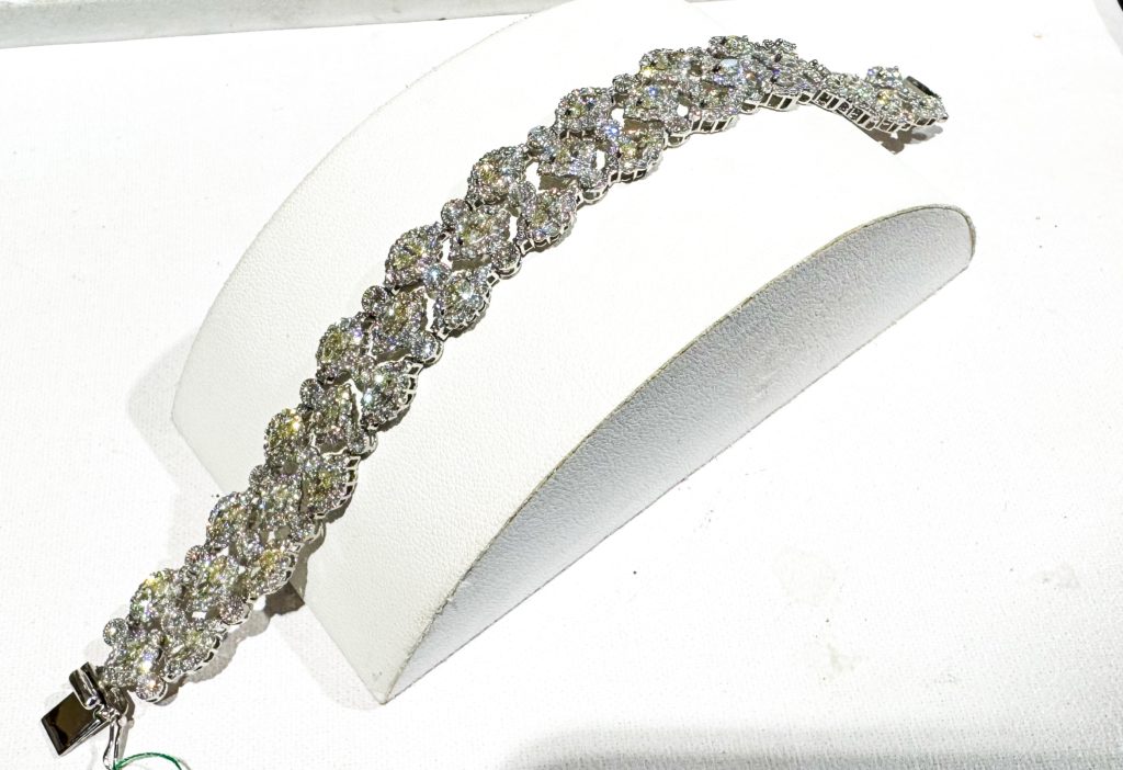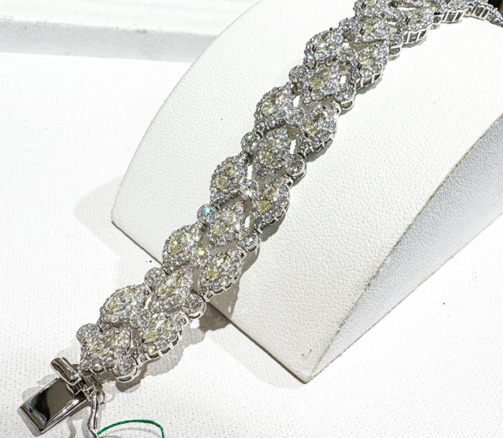 ダイヤモンドブレスレット 2025年1月18日 by ijima Pt ダイヤモンドブレスレット 13.18ct Pt ダイヤモンドブレスレット 13.18ct ファンシーライトイエローのマーキスカットダイヤモンドにメレダイヤモンドを取り巻きしたパーツを組み合わせて手首にやさしく滑らかに沿うように丁寧に造られた高級ジュエリーです。 プラチナを使用していて重量感もあります。 ダイヤモンドの総合計は 13.18ct この場合、それぞれのパーツのセンターに収まられたダイヤモンドのイエローが引き立ち、全治的にメリハリができるデザインなっています。 特別価格 280万円税込