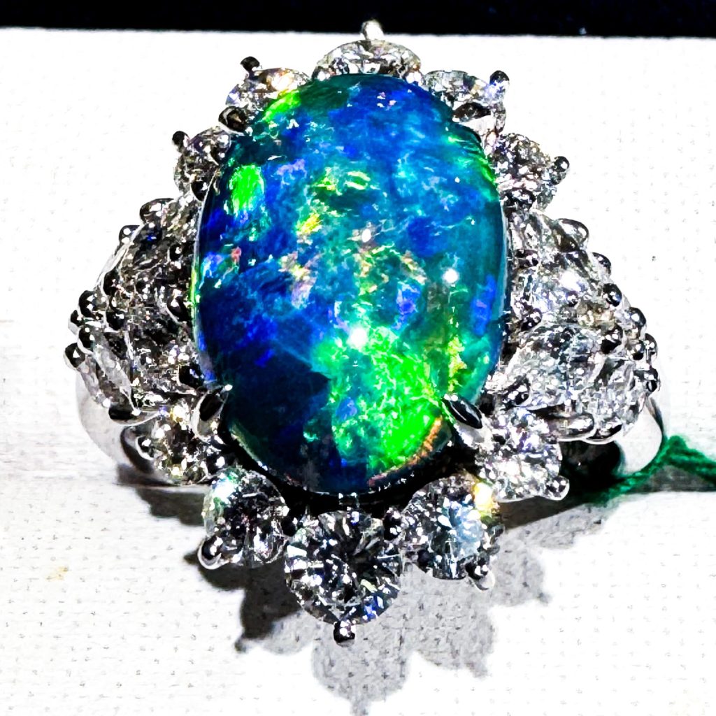 ブラックオパール 2025年2月5日 by ijima 1902年、オーストラリア・ニューサウスウェールズ州ライトニングブリッジから発見されました。 オパールは遊色のバランスと強さが一体となり美しさが増す宝石です。 地色が濃いものがブラックオパールで高品質になります。 大きめの強いパターンが絶妙なこの石は、見る角度によって赤色やオレンジ、黄色といった美しい表情を見せてくれます。 オパールはもともと無処理の石です。 オパール 4.18ct ダイヤモンド 1.90ct