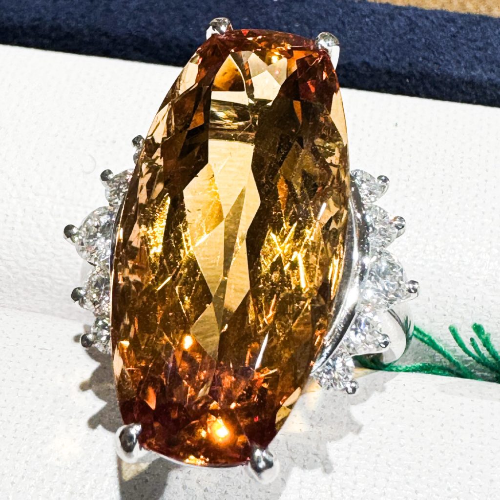 インペリアルトパーズ 2025年2月7日 by ijima オレンジがかった黄色のトパーズをインペリアルトパーズと呼びます。 19世紀後半にアメジストを加熱したシトリンを「ゴールデントパーズ」の名で大量に出回ったために「インペリアル」を頭につけて混同を避けました。 「インペリアル」は、トパーズの主産地であったブラジルに当時在籍いていた皇帝ドン・ペドロ2世にちなんだものです。 写真の石は20ctを超える大きな石で希少なものです。 トパーズ 20.13ct ダイヤモンド 0.85ct