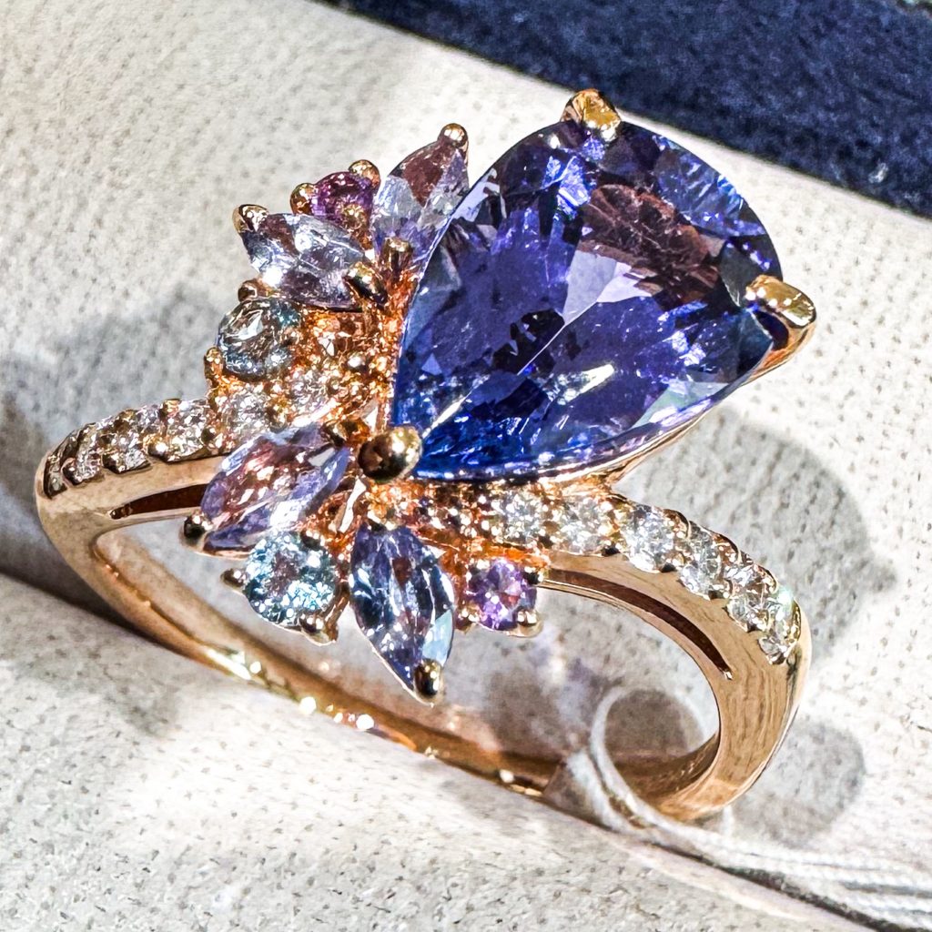タンザナイト 2025年2月27日 by ijima ペアシェープカットの大粒タンザナイトを半貴石とダイヤモンドで装飾し、フレームはピンクゴールドで仕上げました。 少し傾いたデザインは左手の薬指に装着すると流れるようなデザインに見えてすっきりと映ります。 右手の人差し指に装着すると他人から見たときに装飾の半貴石とダイヤモンドがとてもきらびやかに映り、タンザナイトの存在感を引き立たせます。 タンザナイト 2.39ct 半貴石はアメジスト・アクアマリン・アイオライトなど ダイヤモンド 0.23ct 決算特別価格 280,000円税込