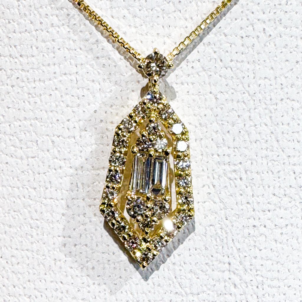 写真は大きく拡大していますが実際に見ると大きな1石のスクエアダイヤモンドが配置されているように見えます。