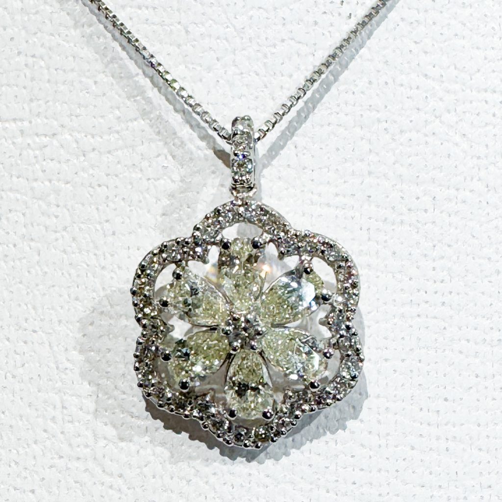 Pt ダイヤペンダント 2025年3月17日 by ijima 0.70ct Diamond Pt900 少しイエロー気味のペアシェープカットのダイヤモンドを6弁、花びらの様にセッティングしました。 中心のダイヤモンドと取巻きダイヤモンドの透明な白さとコントラストになり、花びらの形が浮かび上がります。 ダイヤモンドは全部で0.70ct使用。 プラチナで製作したペンダントです。 税込 150,000円で決算ご奉仕いたします。