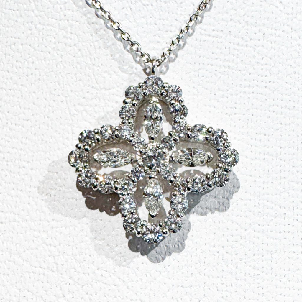 Pt ダイヤペンダント 2025年3月18日 by ijima 0.256ct 0.76ct Pt900 Diamond 幸運の4つ葉のクローバーをモチーフにマーキスカットのダイヤモンドを4枚中心から天地左右に向けて放射状にセッティングしました。 センターダイヤモンドも0.256ctにしっかり大きいブリリアントカット。 メレダイヤとマーキスの総合計は0.76ct 合計1ctを超えるペンダントは、Ptで製作しました。 税込 280,000円