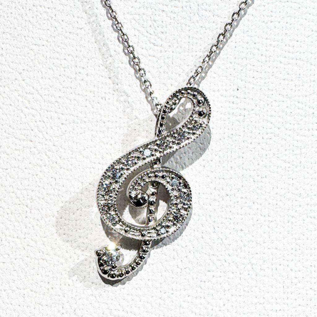 Pt ト音記号ペンダント 2025年3月19日 by ijima 0.15ct Diamond Pt ト音記号 ト音記号をモチーフにした音楽家は欲しくなるアイテム。 ペンダントで吊ると少し斜めに傾くのがかわいい。 ダイヤモンド 0.15ct Ptで製作しました。 税込 128,000円