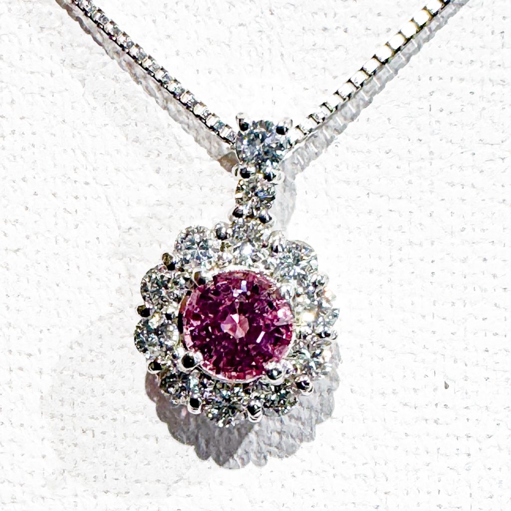 スリランカ産 パパラチアサファイヤペンダント 2025年3月20日 by ijima スリランカ産 パパラチアサファイヤ ペンダント スリランカ産の産地証明が付いたパパラチアサファイヤ。 濃い紫がかったピンク色はファセットごとに色味を変えるのでモザイク模様に観えます。 本物を求める方にご用意いたしました。 中石 0.37ct ダイヤモンド 0.500ct Pt枠 税込 250,000円 決算特別目玉商品です。