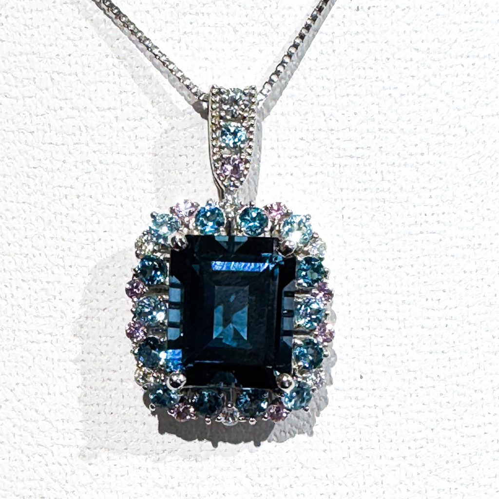 ブルートパーズペンダント 2025年3月24日 by ijima ブルートパーズの大振りの石の周りにサファイヤやブルートパーズのメレ、ダイヤモンドメレをセッティングした豪華で、かわいいデザイン。 以前、同じ型のリングもご紹介しています。そちらも合わせてセットでいかがでしょうか? 中石 ブルートパーズ 4.93ct ダイヤモンド 0.17ct 取り巻き ヴァイオレットサファイヤ 0.17ct ブルートパーズ 0.17ct ptで製作しています。 税込 180,000円