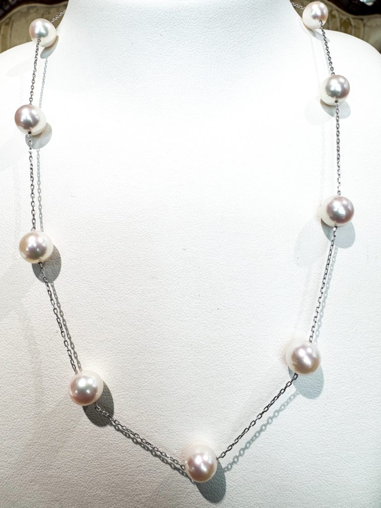 パールステーションネックレス 2025年3月25日 by ijima 天満屋が百貨店になって100周年。 10万円均一の商品に今の時期に人気のパールジュエリーを提案いたします。 K18WGのチェーンにアコヤ真珠を9ピース。 こういうデザインネックレスをステーションと呼びます。 地金が高騰する中、チェーンだけでも10万円する時代に高価な本真珠8mmを使った贅沢なアクセサリー。 この商品も税込10万円でおすすめします。