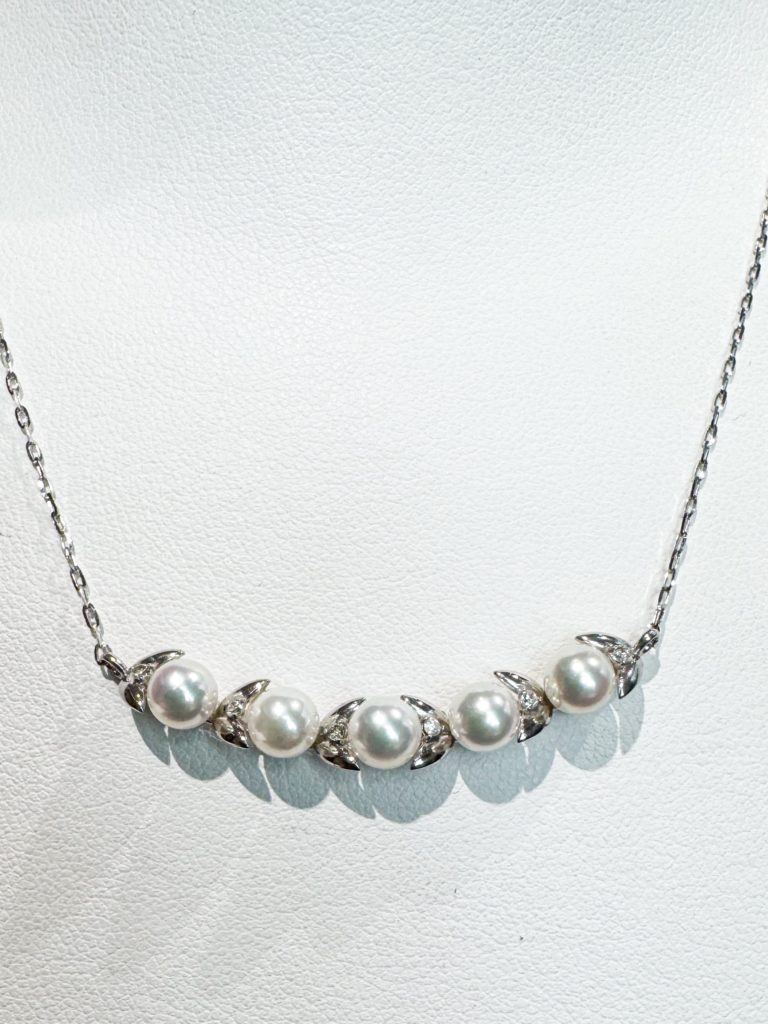 パール一文字ペンダント 2025年3月26日 by ijima 天満屋が百貨店になって100周年。 今日もお買い得な10万円均一商品の紹介です。 チェーンも地金台座もK18WG パールの両端にはそれぞれダイヤモンドを配置。 しっかりと重量感もあるので、安定した着け心地です。 アコヤパールはベビーパールの5mm ダイヤは0.06ct 税込100,000円均一商品です。
