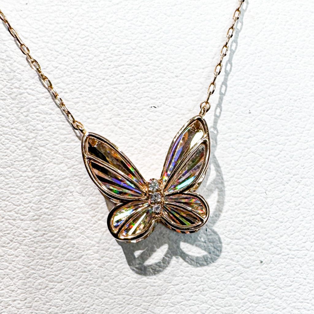 蝶モチーフペンダント 2025年3月28日 by ijima 天満屋が百貨店になって100周年 K18ピンクゴールド地金に同じくK18ピンクゴールドのチェーン付き。 蝶のデザインは二重構造の二階建て。 上の蝶は透かしになっています。一階の蝶はミラー仕上げの地金 周りの光を取り込んで、7色の採光を反射します。 蝶の胴体にはダイヤモンドが0.01ct かわいいペンダントです。 税込100,000円均一商品です。