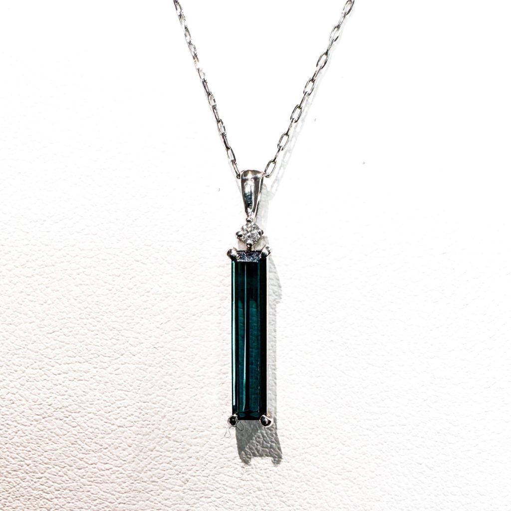 トルマリンペンダント 2025年3月29日 by ijima 天満屋が百貨店になって100周年 原石に沿って縦長くカットされたインディゴブルーのトルマリン。 全く内包物も傷もありません。 スクエアカットでファセットも少ないですが、石がいいので、青、緑をバランス良く発色します。 地金は台座はPt900 チェーンはPt850 トルマリン 1.179ct ダイヤモンド 0.02ct こちらも税込100,000円均一のお得な商品です。