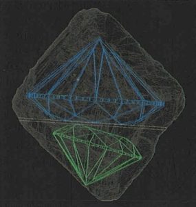 ダイヤモンドの研磨 2025年4月16日 by ijima 原石の内部を顕微鏡で観察しながら、コンピュータ画面上でインクルージョンの位置と大きさを1つずつプロットし、ソーイングの位置をシュミレーションした図が上の図です。 ダイヤモンドは結晶の構造上、ソーイングできる角度が原石の斜め45°の劈開性を利用した角度に限定されていました。 しかし近年はレーザーの導入により、切断面を傾斜させることが可能となり、歩留まりが向上しました。
