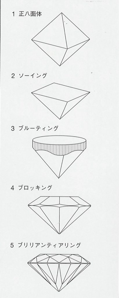 ダイヤモンド研磨の基本工程 2025年4月17日 by ijima 上の図は正八面体の原石が研磨済みラウンドブリリアントカットダイヤモンドに仕上がるまでの主な過程を示したものです。 ダイヤモンドのパウダーとオイルを塗り込んだ研磨盤(スケイフ)で面取りを行います。 近代の技術でコンピュータが導入され多くの作業が自動化されてきましたが、どんなに技術がすすんでもダイヤモンドはダイヤモンドによってしか磨くことは出来ないのです。 そして、優秀なカッターの存在が美しく価値のあるダイヤモンドに仕上げるのです。