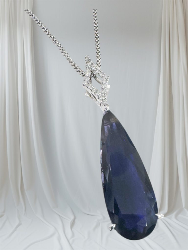アイオライトペンダント 2025年5月8日 by ijima アイオライトは多色性が強い宝石です。結晶の見る方向、研磨の角度の違いから、濃いブルー・褐色を帯びた無色、僅かな青みに変化します。 写真のような透明度の高いバイオレットブルーの美しいものが高品質です。 モース硬度も7~7.5と比較的硬度の高い石です。 無処理アイオライト 8.85ct ダイヤモンド 0.12ct