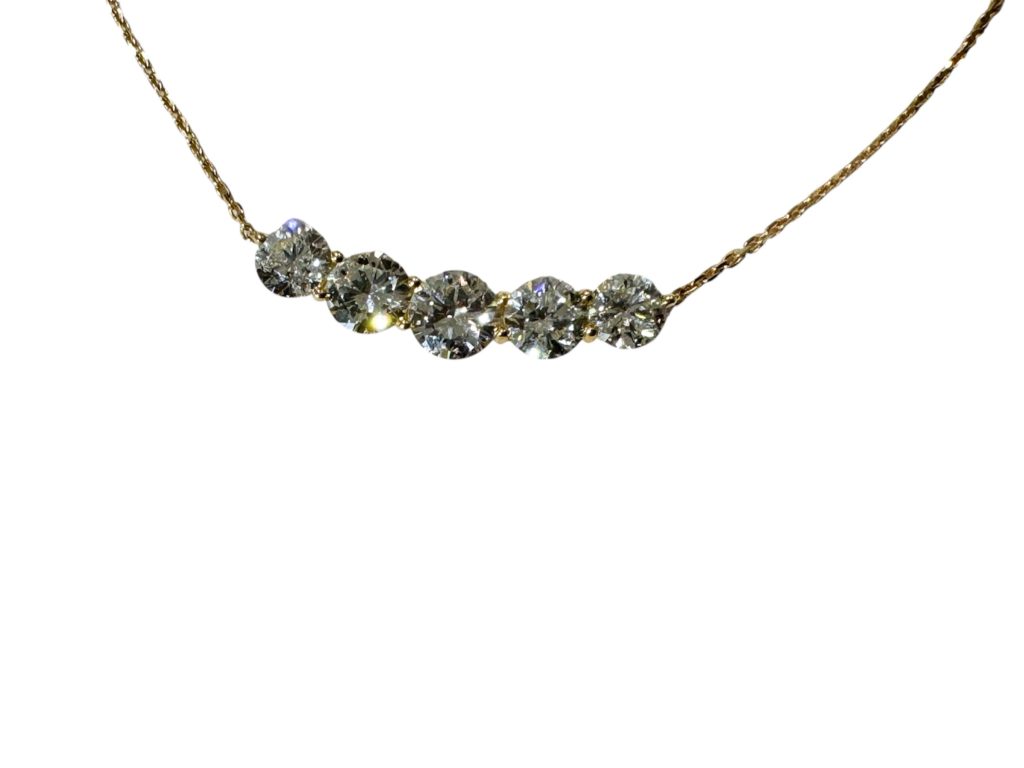 ダイヤ5ケ並ペンダント 2025年6月6日 by ijima ダイヤモンド5ケ並びの豪華できらびやかなダイヤモンドペンダント 全ての石がグレード付で合計は 2.207ctにもなる。 色味が LカラーUPなので、あえて地金はK18YGにしてみました。 SI2 Good以上のグレードを5ピース並べて共爪(共有爪)の4点留め チョーカーで襟のラインに合わせてチェーンを調整すれば、豪華にもカジュアルにも使えます。 今回、ブログを見てご来店いただいた方には 税込 480,000円で販売致します。