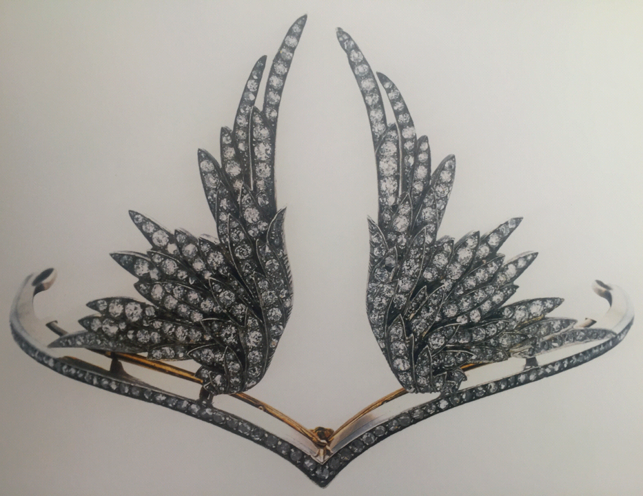 翼 ティアラ 2015年12月29日 by ijima フランス 1899年頃 ダイヤモンド、金、銀 ティアラの下部が下向きにV型になり、翼は横方向にスライドしてブローチとしても着用できます。ダイヤモンドはオールドブリリアントカットとローズカットで覆われています。
