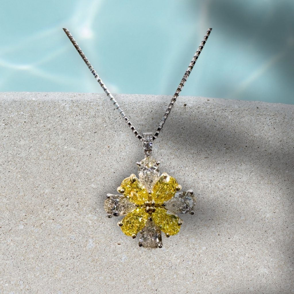イエローダイヤペンダント 2025年7月3日 by ijima Pt/K18 イエローダイヤモンド 0.353ct FIY VS1 / 0.312ct FIY SI2 / 0.307ct FIY SI2 / 0.304ct FIY SI2 中心の4ピースのイエローダイヤモンドは、すべて、インテンスイエローで統一。 脇石 1.310ct センターイエローダイヤ 0.03ct 素敵なデザインに仕上がりました。 特別価格 1,500,000円 でご提供いたします。