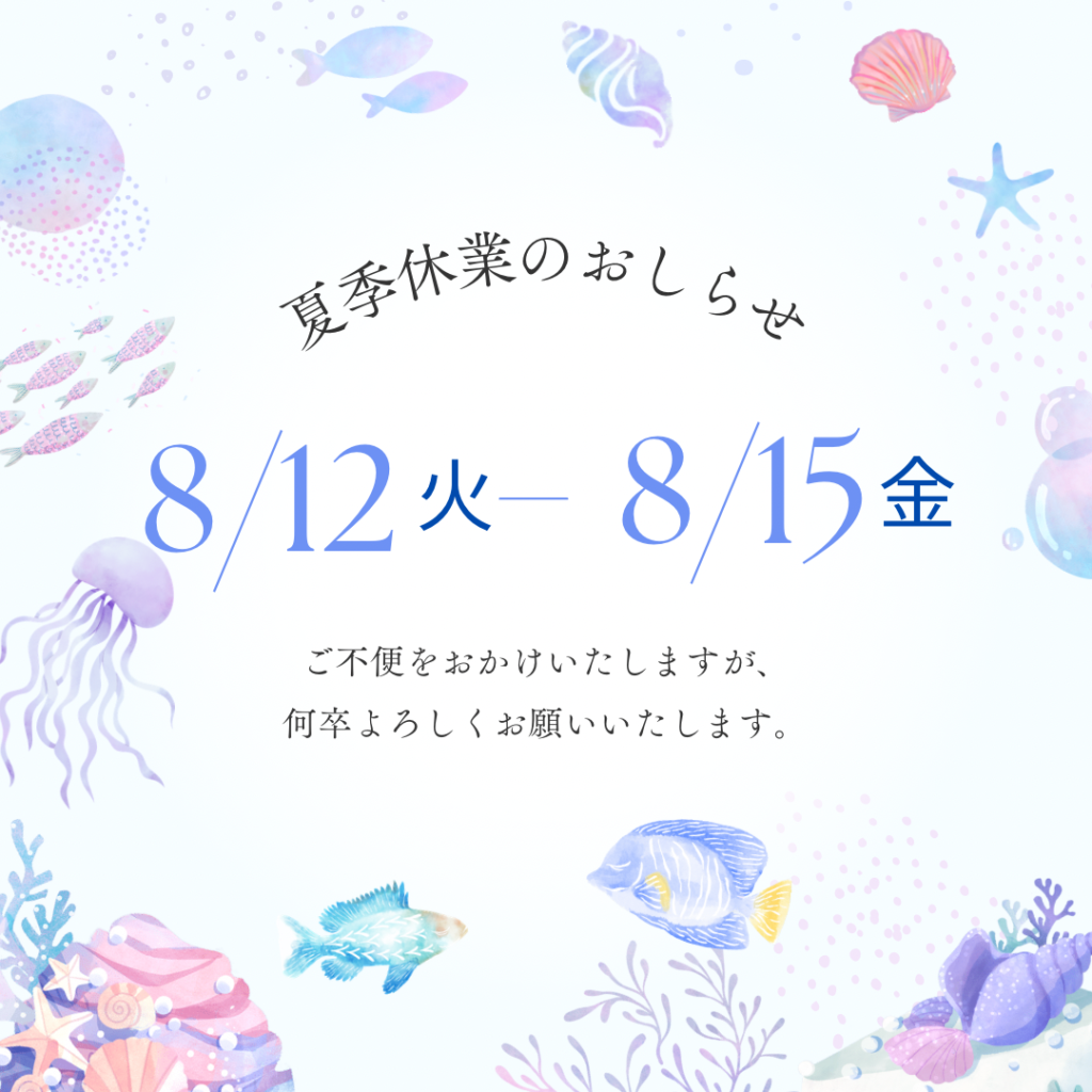 本日より夏季休業します 2025年8月12日 by ijima 本日12日(火曜日)~15日(金曜日) まで夏季休暇をいただきます。 ご不便をおかけいたしますがご了承ください。 店舗もブログも16日(土曜日)から通常とおり再開いたします。