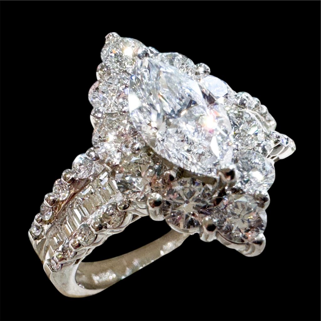 写真の商品は、オーバルカットの周りをマーキス(木の葉型)に膨らみを持たせてダイヤモンドを取り巻きしているので、更に大きなダイヤモンドに観えます。