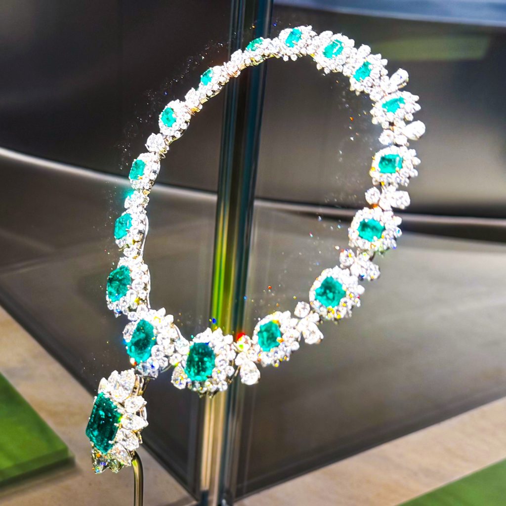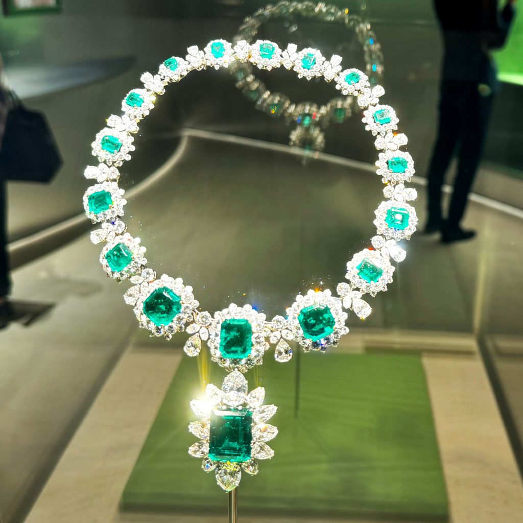 ブルガリ 2025年11月5日 by ijima 国立新美術館の展覧会「ブルガリカレイドス色彩・文化・技巧」 1962年 プラチナ エメラルド・ダイヤモンド ネックレス 先にある1番大きなエメラルドは、取り外し、ブローチになる。 エリザベス・テイラー旧蔵の作品である