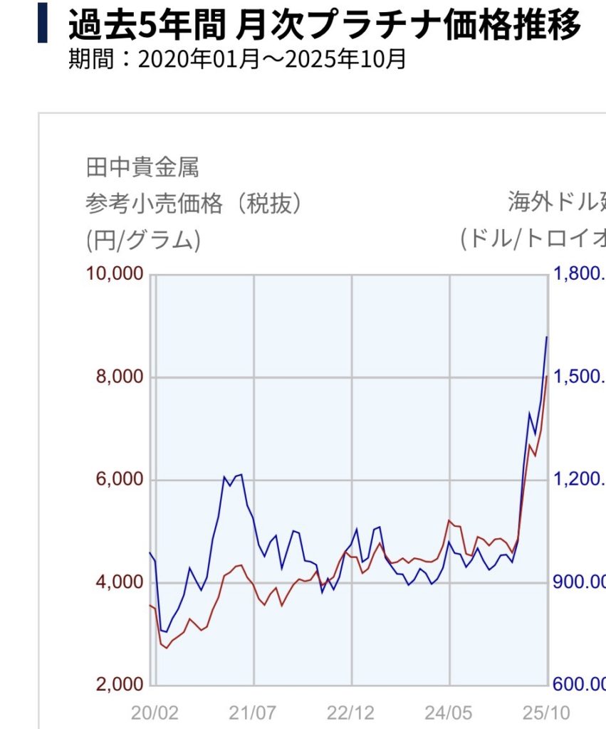 プラチナ価格は、2020年のコロナ禍では一時3,000円代にを割り込む場面もあり「価値がなくなる可能性がある」とまで一部ではいわれていましたが、2025年10月現在、プラチナの価格は上昇しています。2024年のの最高値が1gあたり5,492円だったことを考えると11月は8,977円なので約3,500円近く増加しました。