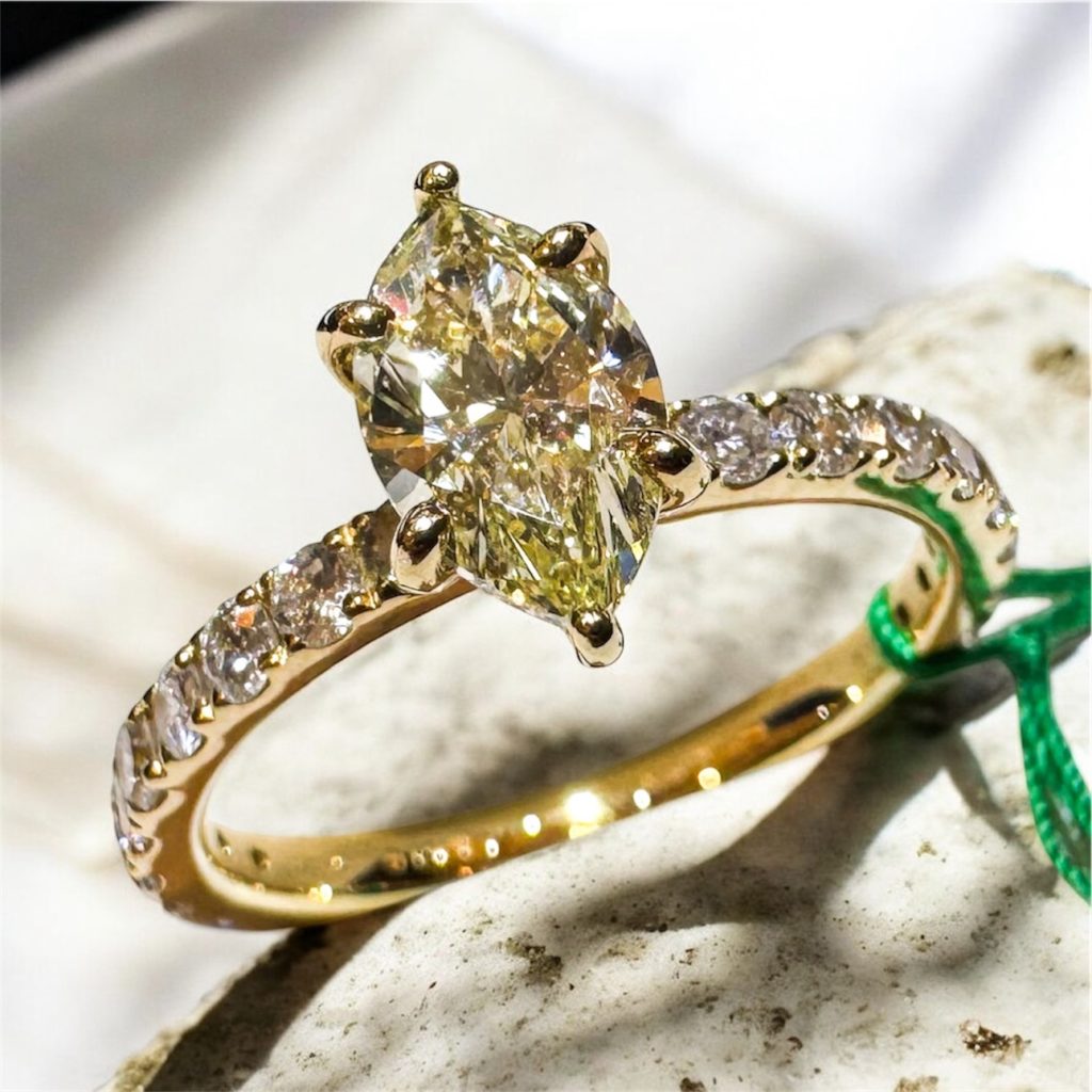 ダイヤマーキスリング 2025年12月24日 by ijima イエローダイヤモンドを品よくシンプルにK18枠に石留めしました。 バランスのいいマーキスカットは大変希少です。 中石 1.010ct LY(ライトイエロー) VVS1 歳末特別価格 税込 700,000円
