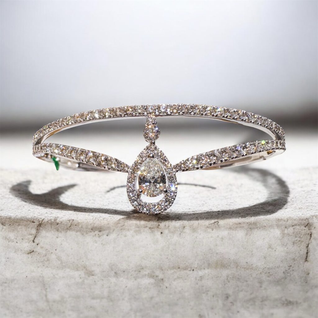 ダイヤ バングル 2026年1月9日 by ijima ペアシェープカットのダイヤモンドを中心にティアラのようなデザインに仕上げたバングルです。 K18WG で加工されています。 センターダイヤモンドは 0.51ct H カラー SI2 ペアシェープカット 脇石 2.50ct 使用 ダイヤモンドが非常にきれいな高品質を使っていますので、眩しいほどの輝きです。 お正月特価 税込 1,380,000円