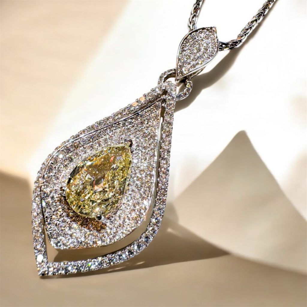 ダイヤペアシェープペンダント 2026年1月16日 by ijima センター 3.5ct のペアシェープカットダイヤモンド メインのダイヤを石留めしている板にもメレダイヤモンドをパヴェ(石畳のように)状に敷き詰めていて、その板は、自由に揺れるように作られています。 更に取巻きダイヤモンドをあしらって、大変豪華でオシャレなペンダントです。 センターは 3.517ct LY(ライトイエロー) VVS1 メレダイヤモンド 1.45ct ptで手作りで製作した 一品です。 決算処分特別価格 税込 3,800,000円