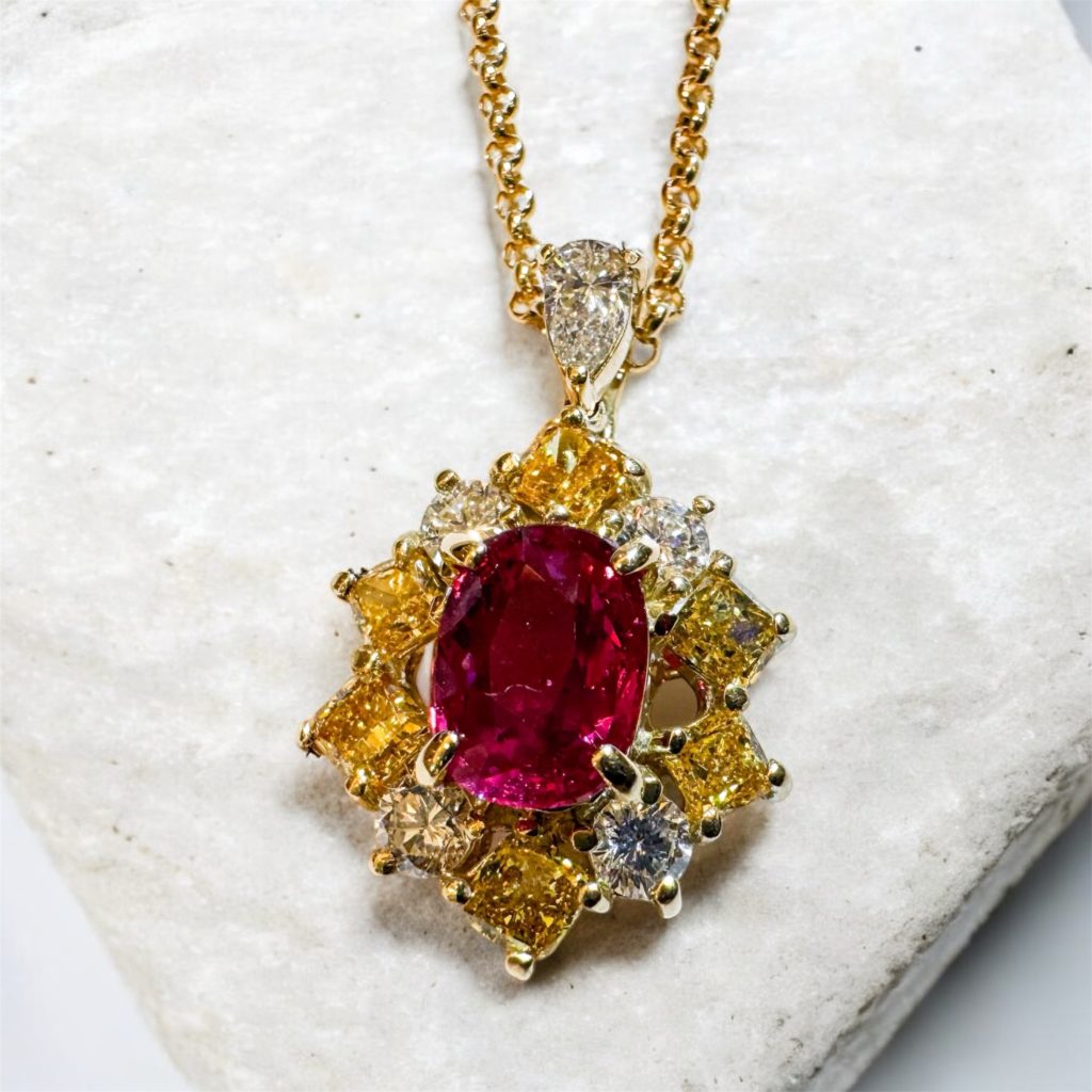 ルビーペンダント 2026年1月19日 by ijima K18 ルビーペンダント イエローダイヤモンド巻 センターのルビーは 非加熱ノーヒート・モザンビーク産 2.16ct の大変希少な逸品ルビーです。 K18地金を使用してイエローダイヤモンドを取り巻きしています。 黄色と赤のコントラストは意外にきれいだと気付かされる。 決算処分特別価格 税込 2,500,000円