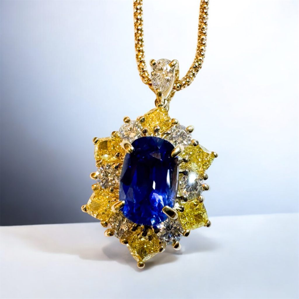 サファイアペンダント 2026年1月20日 by ijima K18 サファイヤペンダント イエローダイヤモンド巻き センターは、3.15ctのコーンフラワーサファイヤ(鑑定書付き) K18地金を使用して、イエローダイヤモンドで取巻きしてみました。 青と黄は反対色でハレーションを起こすかと思いきや、製作して製品になると、黄色は濃く見え、サファイヤものコーンフラワーの淡いブルーがしまりました。 決算処分特別価格 税込 3,000,000円