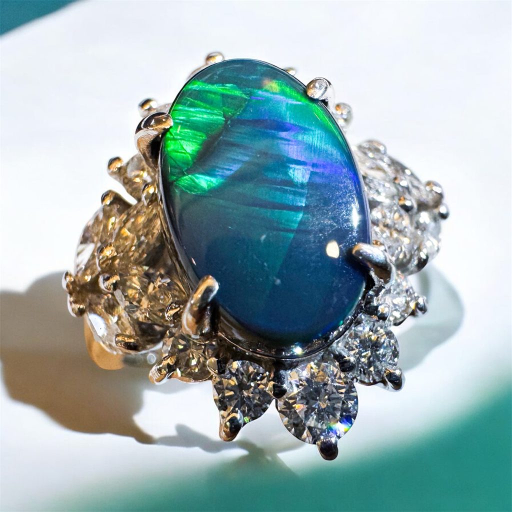 ブラックオパールリング 2026年1月31日 by ijima Pt ブラックオパール ダイヤ巻き リング 中石 2.60ct オーストラリア産 ライトニングリッジ鉱山 ダイヤモンド 1.09ct オパールは遊色の中で人気の高いブルーとグリーンが大きなパーツのパッチワークの様に彩られた逸品。この大きめのパターンは絶妙で大変希少です。 角度を変えると次々と美しいパターンを見せてくれます。 決算処分価格 税込 1,680,000円