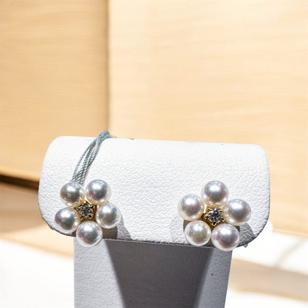 パールピアス K18 2026年2月17日 by ijima K18 あこや真珠 ピアス 3.5mmあこや真珠(ベビーパール)を5珠づつ配置した、定番花形のピアス。 中心にはダイヤモンド 1点限りの処分価格です。 税込10万円で販売いたします。
