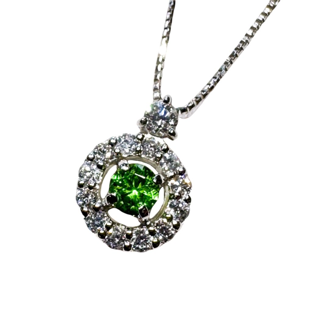 10万円均一 希少石シリーズ 2026年2月25日 by ijima Pt デマントイドガーネットペンダント 希少石のデマントイドガーネット 0.14ct 力のあるグリーンの宝石 1860年からロシアのウラル山脈で採掘が始まりました。 現在は、ナミビアとマダガスカルからも産出します。 強い分散光とホールステール・インクルージョン(馬の尾のようなインクルージョン)が特徴です。 デマントイドとは、ダイヤモンドのようなという由来です。 鑑別書付き 税込 100,000円 で1点限り