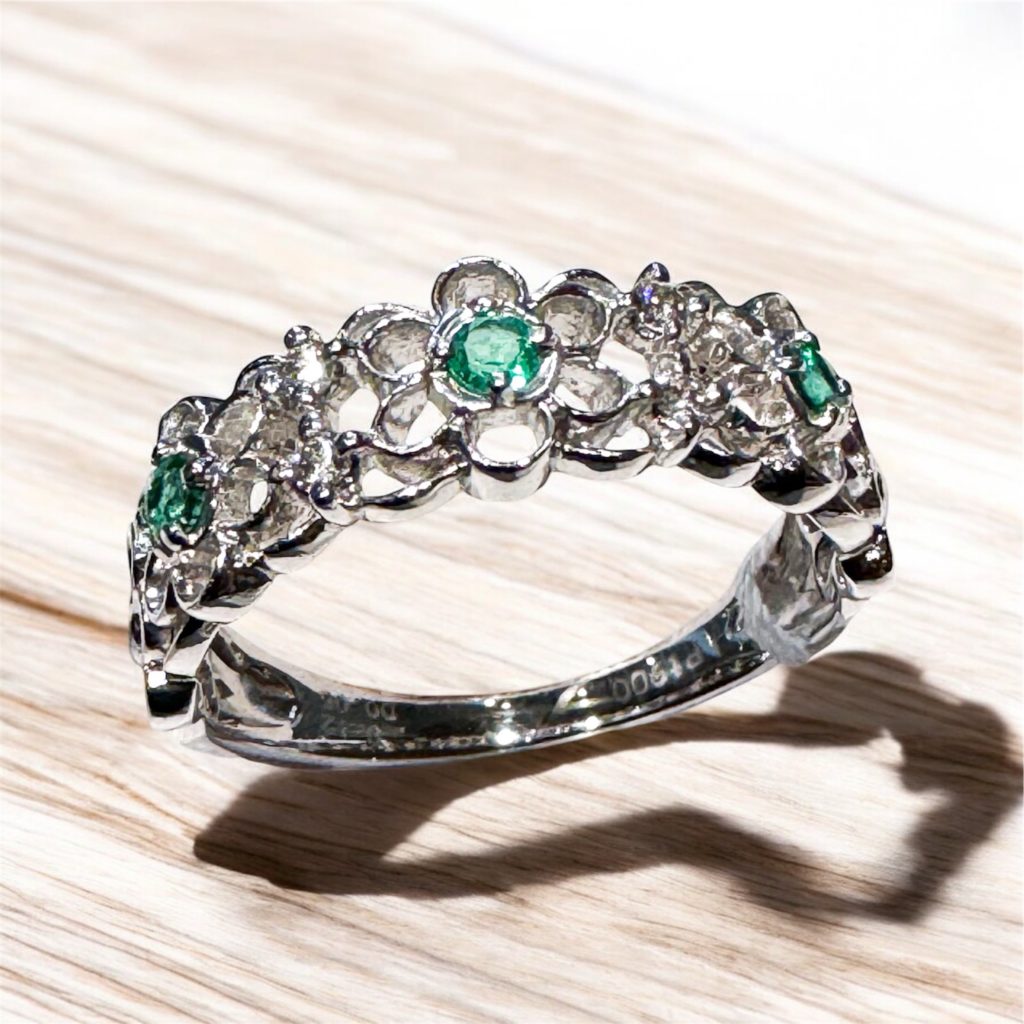 エメラルドリング 10万円均一 2026年3月6日 by ijima Pt エメラルド・ダイヤモンドリング エメラルドのファッションリングの依頼が多いのですが、材料になる小粒のエメラルドさえ入手が困難になっていまして、なかなか制作までに至りませんでした。 数年前の作品ですが、地金もまだ安定している時期のもので、しっかりとしています。 花柄が可愛くキュートです。 税込 100,000円 で一点だけ