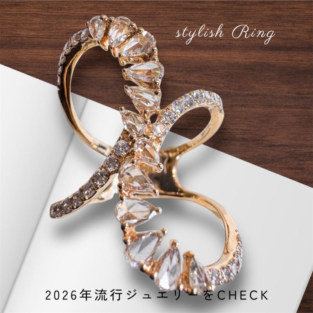 ダイヤモンドリング 2026年3月27日 by ijima K18PG ダイヤモンドリング 0.90ct スタイリッシュな、ローズカットダイヤモンドを使用した 2026年の新しい感覚のジュエリーリング。 ピンクゴールドは、繊細で細かい加工が苦手でした。近年、技術がすすみ、このような0.10mmの爪留めを可能にし、ローズカットのぺシェープも3点留めで石留めを成功しました。 インデックス(人差し指)や中指にお使いいただけると、細く長い指に観えます。 動きのあるデザインは、今後、流行間違いなし! 税込 380,000円