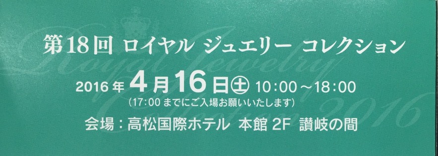 高松ロイヤル会 2016年4月10日 by ijima いよいよ、今週末の土曜日は、高松国際ホテルにて、『第18回 ロイヤルジュエリーコレクション』の開催です。 今年も最高のトップファッションジュエリーを心ゆくまでお愉しみいただけますよう、特別な企画をご用意して皆様のご来場を心よりお待ちしております。
