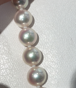 しかし、ワイヤーなどの硬い糸は真珠を痛めてしまいます。そこで、苦肉の策で珠の間にシリコンの小さい珠を挟みます。7㎜珠のネックレスで約60珠で40㎝のネックレスになりますから、0.5㎜程度の珠ですが、すべてに入れると3㎝長くなるため、約4珠〜5珠、肝心な真珠を減らします。
