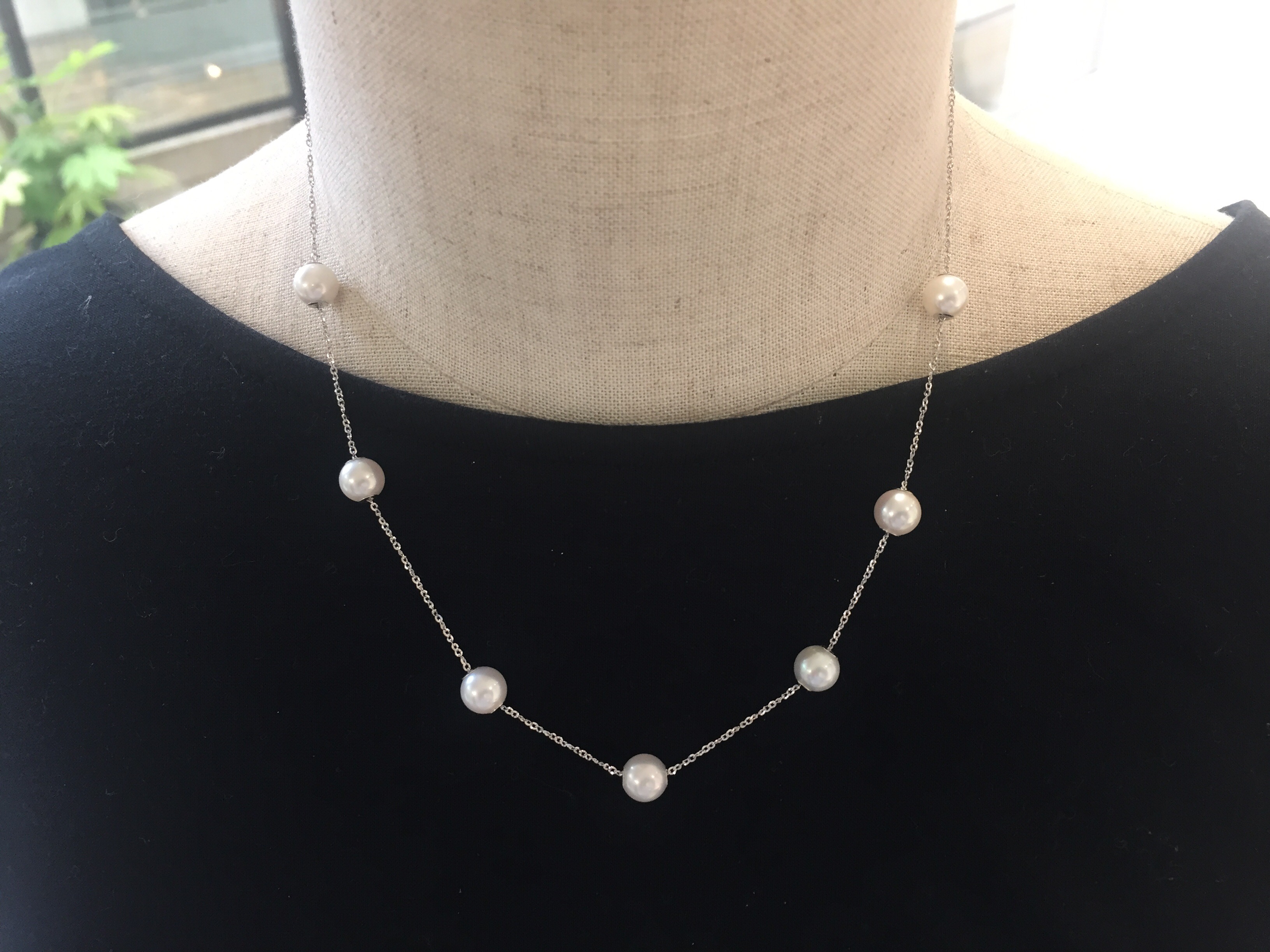 ステーションネックレス 2016年6月29日 by ijima 品のある白は目に優しく、肌の色にもしっとり馴染みます。 パールは自由に移動できるようになっていて、デザインをアレンジすることができます。 7〜7.5mm K18WG 54,000円