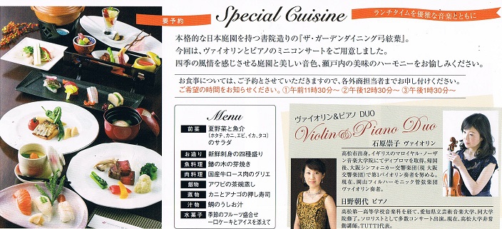 弓絃葉 宝飾展示会のお知らせ 2016年9月1日 by ijima 9月15日(木)に 屋島にある「ザ・ガーデンダイニング弓絃葉」にて、秋のブランドジュエリーフェアを開催いたします。 ランチと優雅な音楽とともに開催する展示会です。食事については、予約制となっておりますので、当サロンまでお申し込みください。
