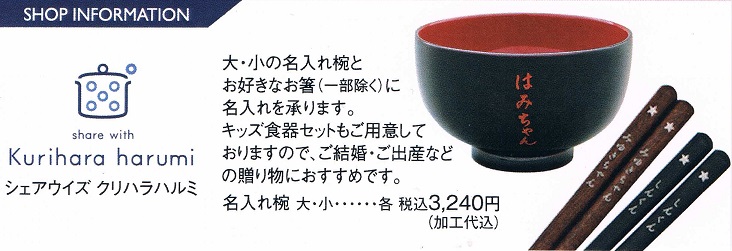 Kurihara harumi の箸や椀に名入れをしていただけます。お祝いごとの贈り物に喜ばれそうですね。