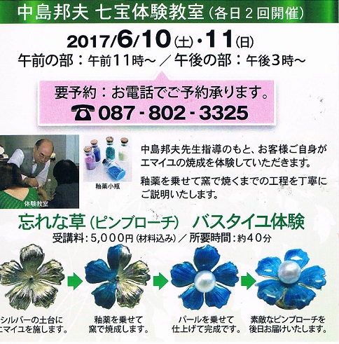七宝体験教室のご案内 2017年5月25日 by ijima 中嶋邦夫先生 が来店いたします。中嶋先生 自らご指導いただき ご参加のお客様に七宝を体験していただきます。出来上った七宝は、後日お渡しいたします。受講料は、材料代込で 5,000円です。満員になり次第、受付を終了いたしますので、お早めにお申し込みください。