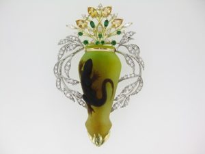 また、デザインに具像のもの(花鳥風月・風景・女性の裸像・爬虫類)などが多く、色石で表現すると高価で重くなるため、安価で仕上がりがきれいなエナメルが選ばれたのでしょう。