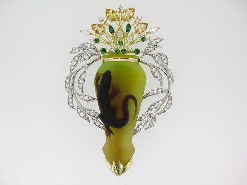アールヌーヴォーと呼ばれる芸術運動の中、この時代のジュエリー作家は、素材価値を軽視しデザインなどの美的価値を重視する考えを持ち、多彩なエナメルを用いたジュエリーが多くなってきます。