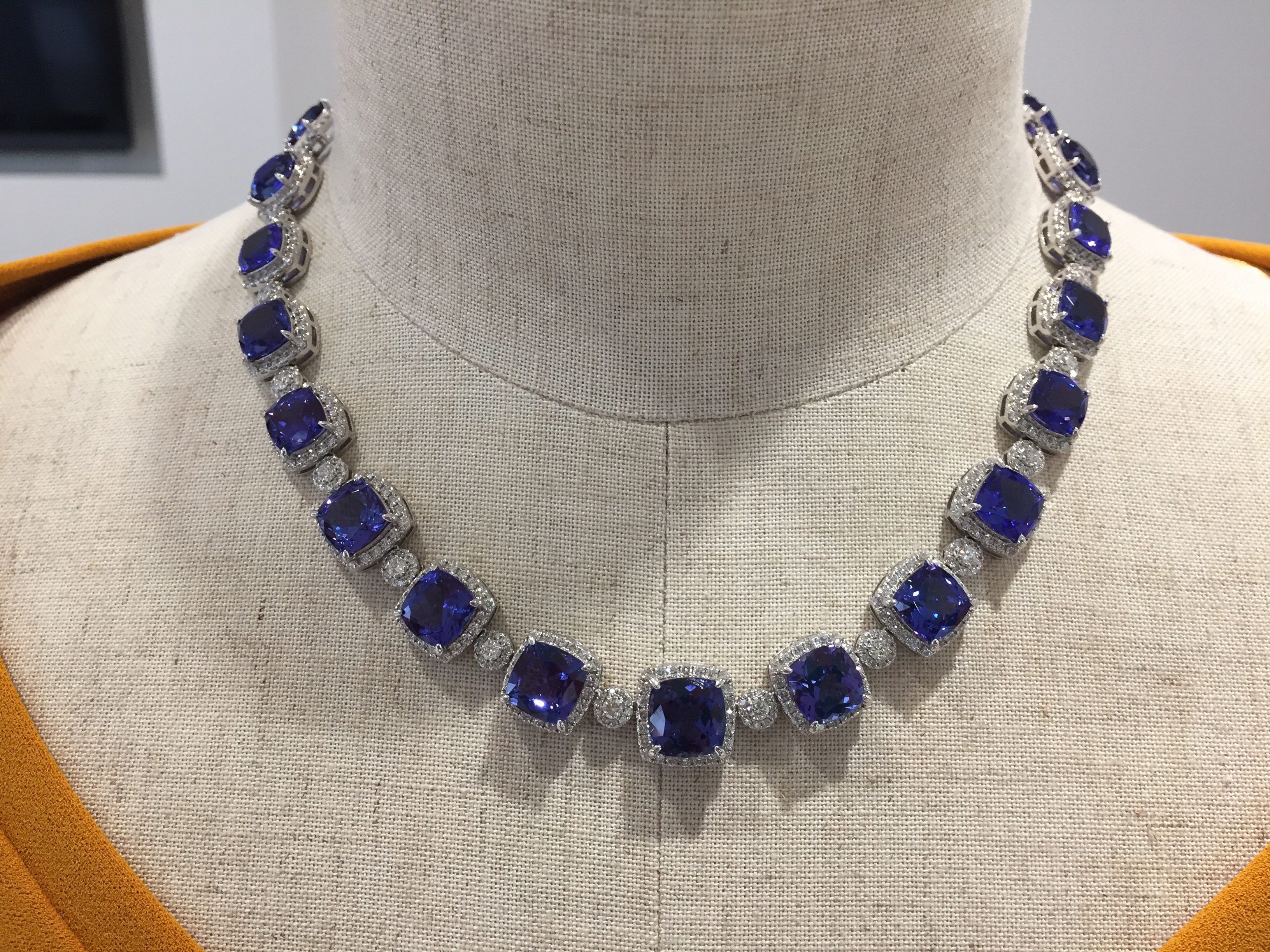 デコレーションネックレス② 2017年6月17日 by ijima 昨日に引き続き、豪華なデコレーションネックレスの紹介です(^^) 青色と紫色の2色性を持つ タンザナイトのネックレスです。 色と型を石合わせするのに使う資金力、根気、時間は、当然、着飾る女性を更に美しく高貴に変身させる事でしょう。 タンザナイト 総重量 67.2ct 脇石ダイヤ は 10.25ct もう、価格の話題はやめておきましょう(^^)