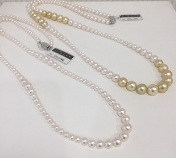 新作 パールロング 2017年7月3日 by ijima パールロングネックレスのグラデーションを試作しました。‥‥と言っても、このような作品を作るには色照の揃った大きさ別の真珠を大量に仕入れしなければなりません。もちろん大量に出来上がるわけで(-。-; 利幅を上げて販売するなら、一本あたり80万〜100万で売ればいいのですが、当店は、価格をギリギリまで下げて皆様に安価でお届けします。そのかわり、8月までには売りきりをしないといけません(o_o) 左の白一色は、税込270,000 右の金白は、税込400,000 お早めにどうぞ(^^)