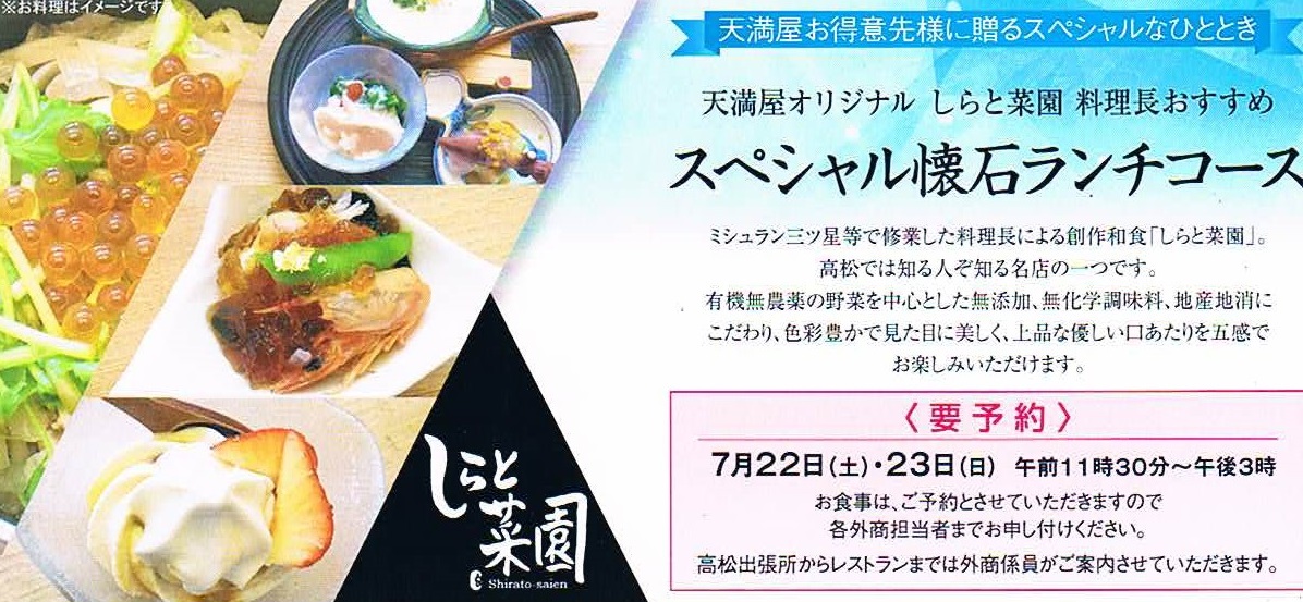 催事 イベント② 2017年7月12日 by ijima 22日(土)・23日(日)の催事2日間ともにお越しいただいたお客様全員にランチをご提供いたします。特別なコースですから予約が必要です。前にブログでご紹介した「しらと菜園」さんにご協力いただきまして、二日間 貸切で天満屋スペシャルランチをお楽しみいただきます。