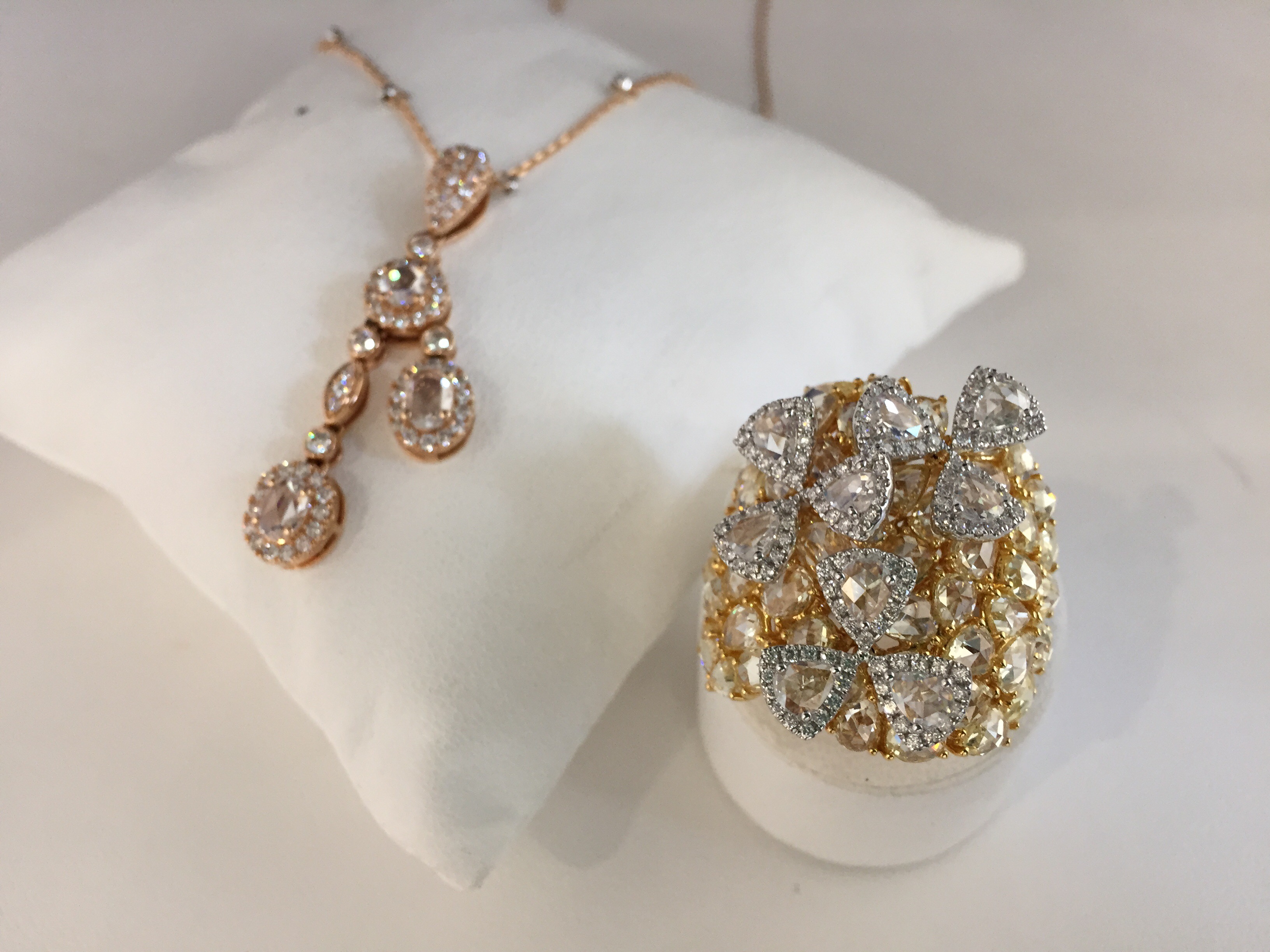 ローズカット 2017年7月16日 by ijima ダイヤモンドのカットが石を擦るしか方法が無かった時代、マリーアントワネットがダイヤモンドを好んで着けていた時代のダイヤモンドのカット。原石の形(正八面体)を生かしたアンティークカット。 反射は鈍くなり、キラキラ感は無いが、優しい輝きです。 ペンダントは、ローズカット 0.85ct 脇石 0.95ct 864,000円。 リングは、イエローのローズカットダイヤモンドを金色の爪で石留めしています。合計 12.145ct 5,400,000円