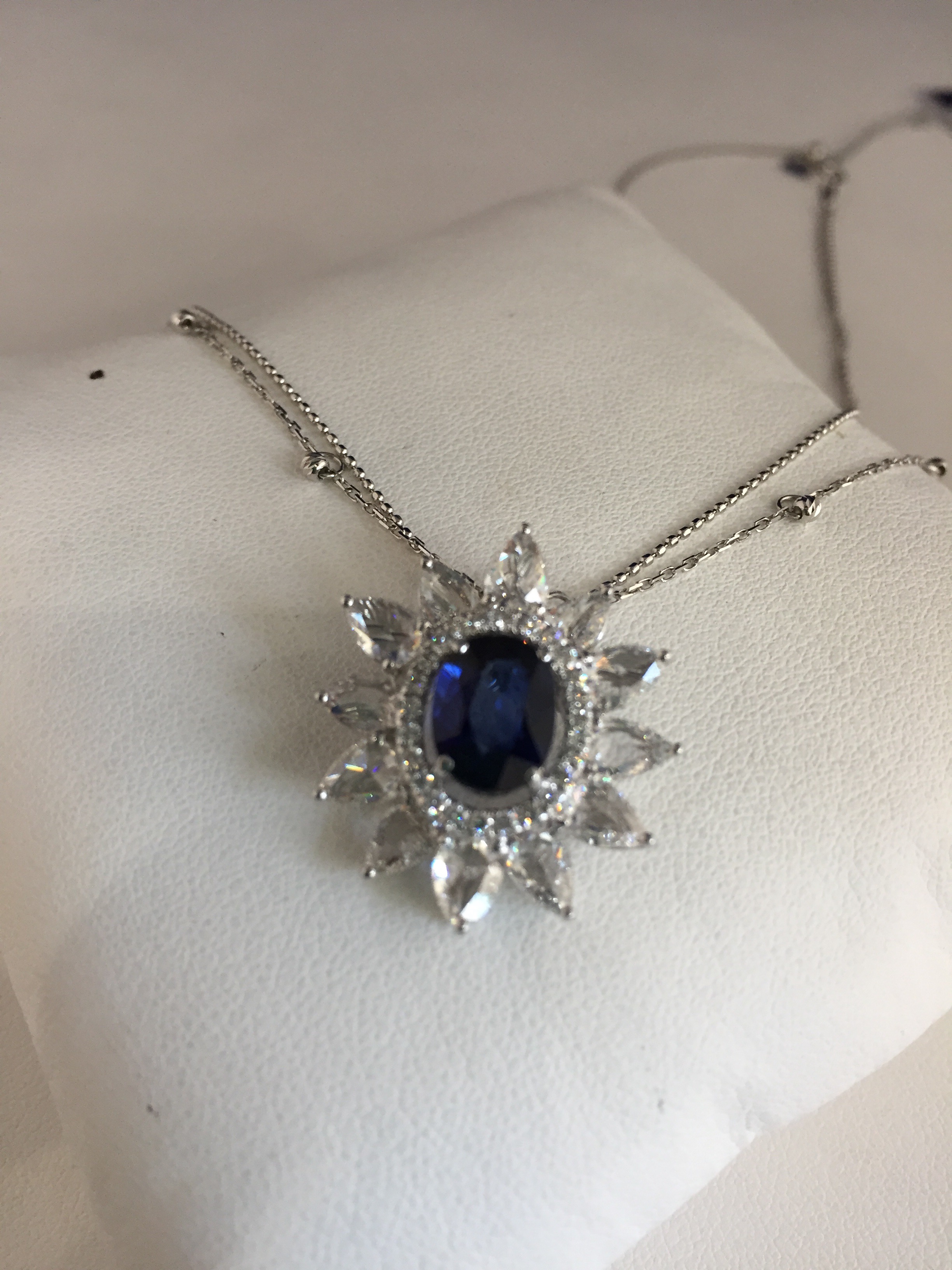 ローズカットの加工 2017年7月17日 by ijima サファイアにローズカットのダイヤモンドを取り巻きしたペンダント。上から見るとダイヤモンドの爪しか見えない。地金が見えないのである。普通、台座の上に載せるので、上から見て台座が目に見えるのだが(o_o) 裏側を見ると、確かに台座は存在しています。 やはり、0.2mmの爪と微妙な台座位置なのでしょうか。他のブランドはまだまだ研究して欲しい(^^) サファイア 2.26ct ダイヤモンド 0.81ct 3,780,000円
