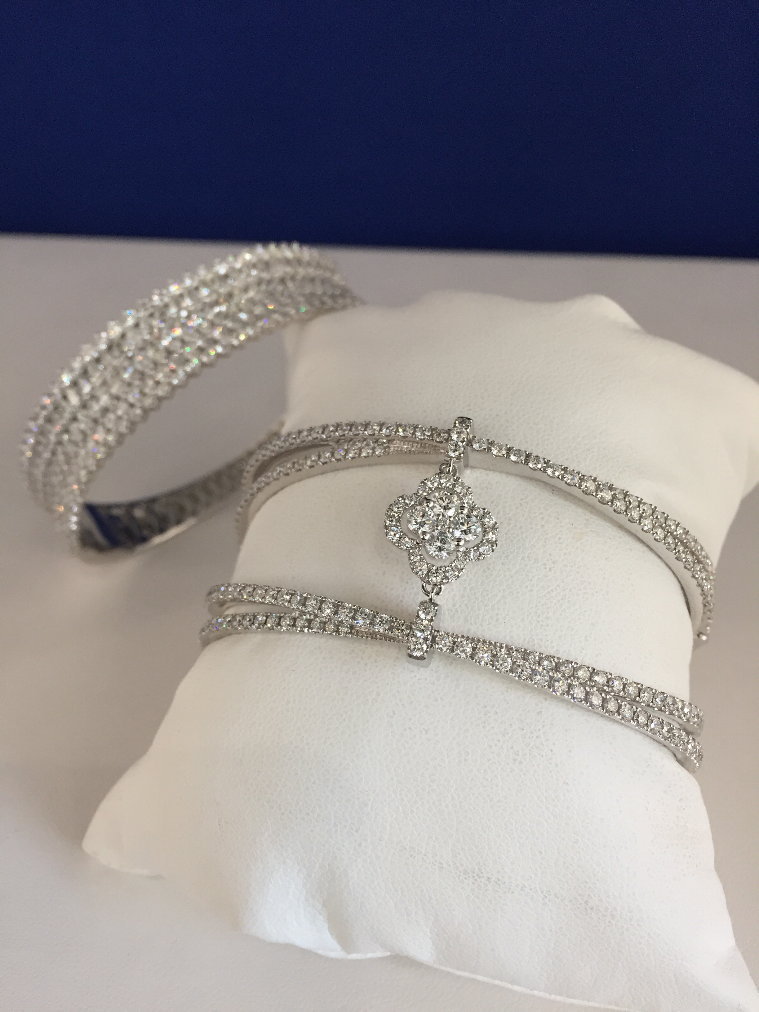 バングル 2017年7月18日 by ijima 先日のレッドカーペットで、世界のセレブ女優や歌手の皆さんが、大きなダイヤモンドのバングルを着けて登場した。 ダイヤモンドをつなげたテニスブレスと言われたブレスレットを着けている人は誰もいなかった。 これからの主流は、このバングルなのだろう。 なるほど、東京からの帰りの羽田空港ラウンジで、デニムにTシャツ、腕にダイヤバングルという、オシャレなセレブに会った。かっこ良かった(^^) 左バングル 16.26ct 6,480,000円 右バングル 4.05ct 2,700,000円