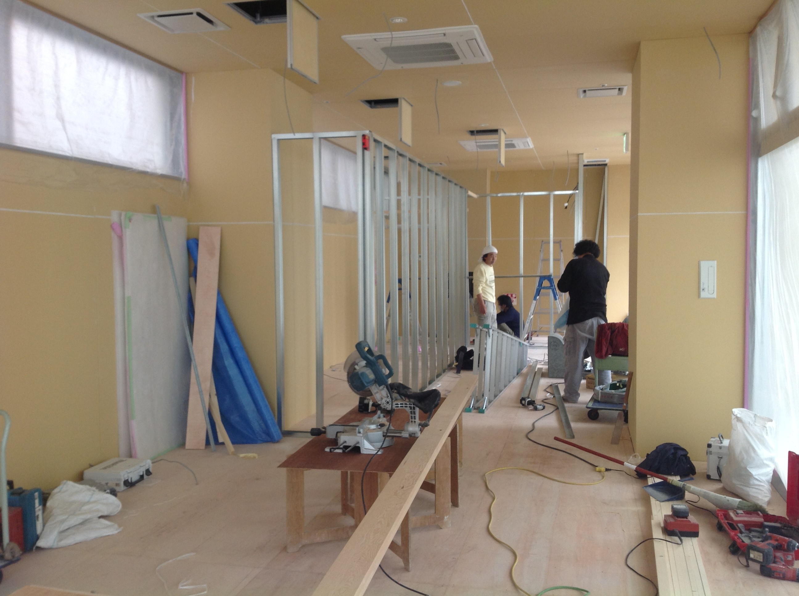 内装工事 2015年4月30日 by ijima 内装は、友人の「アロハリフォーム」の荒川社長さんに依頼しました。 防犯対策に頑丈な金庫室を造作し、事務所と店舗の仕切りを造作。簡単そうですが、これがスプリンクラーの位置がどうの、煙の通り道がどうの・・・と消防法が邪魔をするんです。 荒川社長の機転ですべて解決し、なんとか間仕切りも頑丈に完成しました。 これで、私のイメージしていたサロンが形になってきました。 つづく・・・
